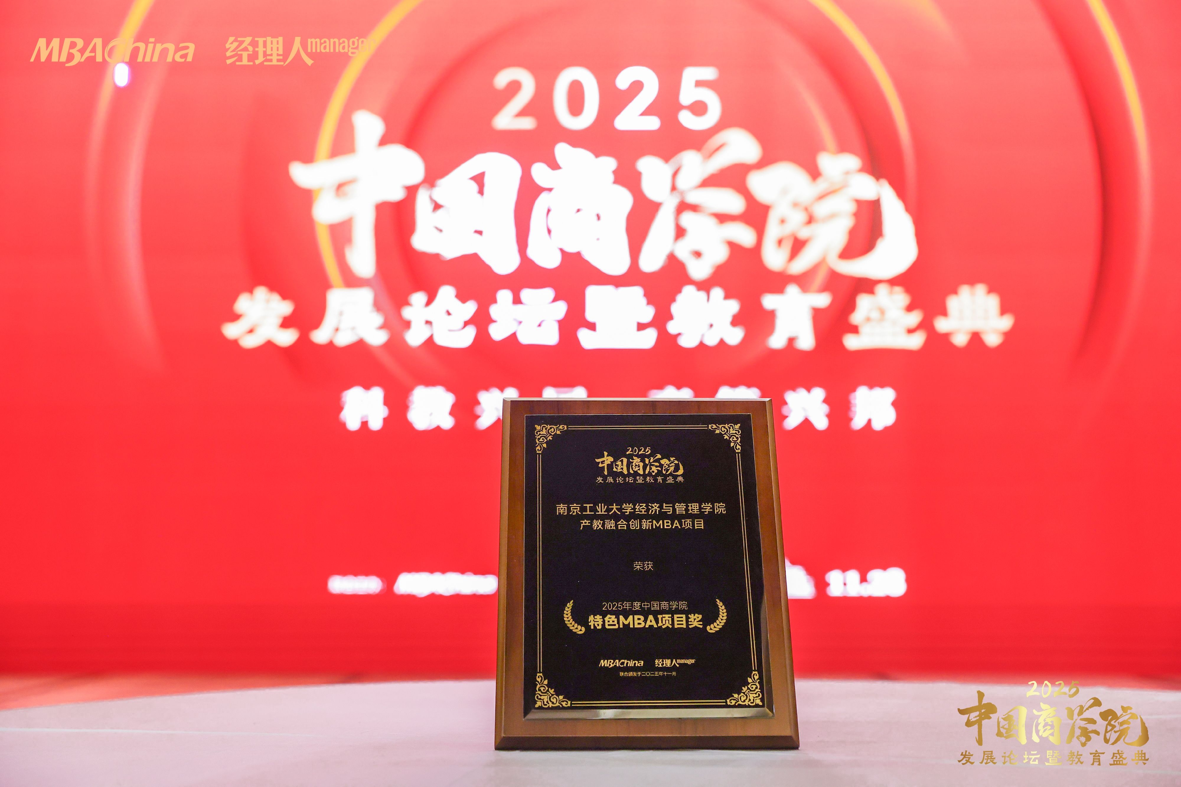 11月28日,“2025年度中国商学院发展论坛暨教育盛典”在北京成功举办。本届论坛主题为“科教兴国,商管兴邦”,来自全国百余所院校的三百余位院校领导、专家学者及相关负责人参加会议。我校MBA教育中心李宏贵主任和沈晖老师参加了会议。现场发布了2025年度中国商学院MBA项目系列榜单,南京工业大学MBA项目荣登“2025年度中国商学院MBA项目TOP100榜单”,产教融合创新MBA项目荣获“2025年度中国商学院特色MBA项目奖”。